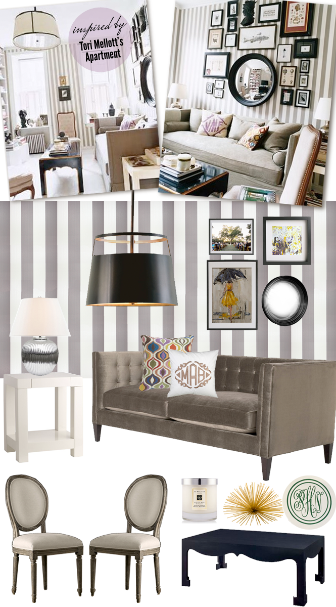 The inspiration images are of Tori Mellott's living room, photographed by Annie Schlecter and were featured in Domino Magazine. You can read more about her and her apartments and see other pictures on La Dolce Vita and So Haute Style (both of which came up when I uploaded my picture). So here's my take on the room. I'm now dying for that sofa.